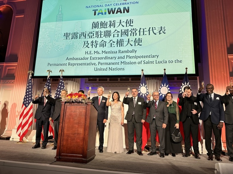 紐約中華公所主席朱超然、台灣會館理事長蘇春槐與聖露西亞駐聯合國常任代表蘭鮑莉(Menissa Rambally)在場發表賀詞,祝中華民國台灣114年生日快樂。