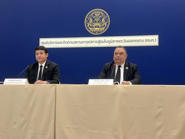 11 日於泰國政府大樓(Government House)舉行的記者會中,總理府部長善提(Santi Piyatat)與泰國外交部代理資訊局局長兼副發言人帕尼東(Panidon Patchimasawat)說明中東局勢發展及泰國公民撤離進度。