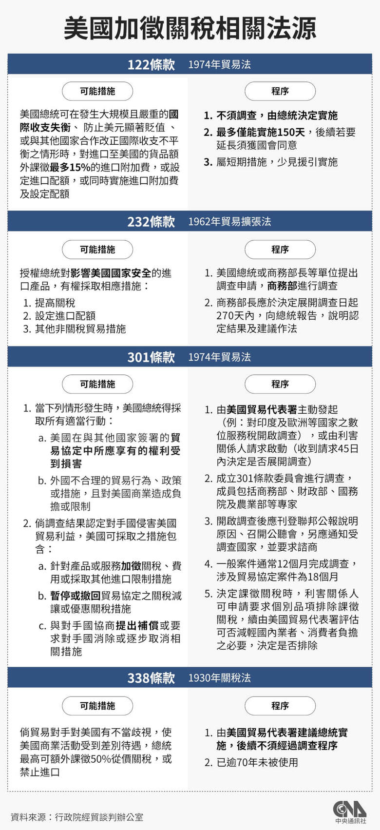 美國最高法院上週裁定總統川普根據1977年「國際緊急經濟權力法」(IEEPA)對各國課徵對等關稅逾越職權後,川普隨即援引1974年貿易法「122條款」宣布對全球進口商品徵收新的15%關稅,後續可能採取1962年貿易擴張法「232條款」、1974年貿易法「301條款」以及1930年關稅法「338條款」等調查。其中122條款目的在解決美國國際收支嚴重失衡,或防止美元在外匯市場大幅貶值情況,其最多僅能實施150天,後續若要延長須獲國會同意。(中央社製圖)