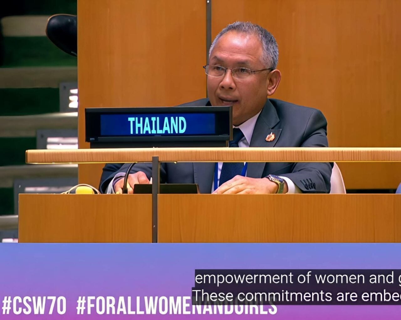 此次會議於紐約時間3月11日17時舉行。泰國社會發展與人類安全部(Ministry of Social Development and Human Security)常務次長甘塔蓬(Kantapong Rangsisawang)以泰國代表團團長身分在會議上發言。與會泰方代表還包括婦女事務與家庭發展廳(Department of Women’s Affairs and Family Development)廳長乍都蓬(Jatuporn Rojanapanich)及相關官員。