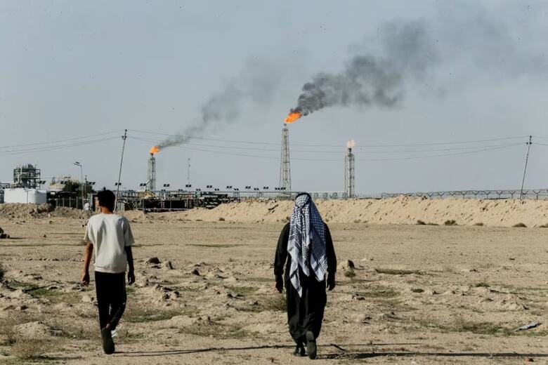 圖為9日伊拉克蘇貝爾油田附近農地可見遠方天然氣燃燒火光。(路透社)