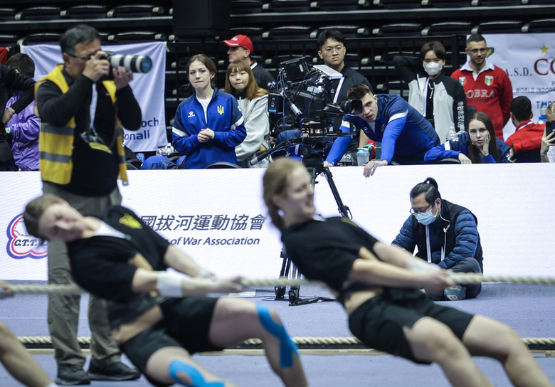 世界室內拔河錦標賽首度在台灣舉行,烏克蘭拔河國家隊選手、現役烏克蘭軍人的謝夫楚克參加女子和男女混合項目。圖為謝夫楚克(後左藍色外套者)12日為烏克蘭國家隊的隊友加油。(中央社記者裴禛攝)
