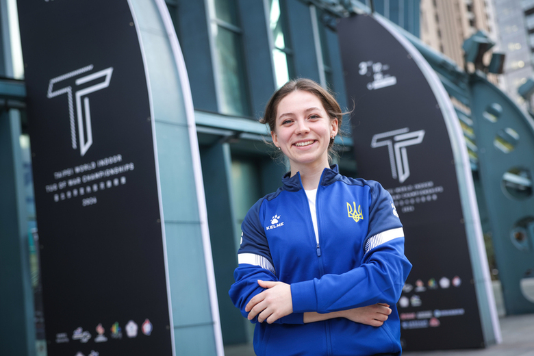 烏克蘭拔河國家隊選手謝夫楚克目前於烏克蘭軍隊服役,此次來台參加2026年台北世界室內拔河錦標賽,也是她第一次造訪亞洲國家。(中央社記者裴禛攝)
