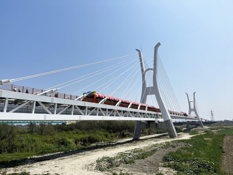 北港溪渡槽橫跨河寬達465公尺,採用斜張橋模式以纜繩拉持,設置2個落墩,施工過程歷經4次地震、6次颱風,完全通過考驗。(中央社記者姜宜菁攝)