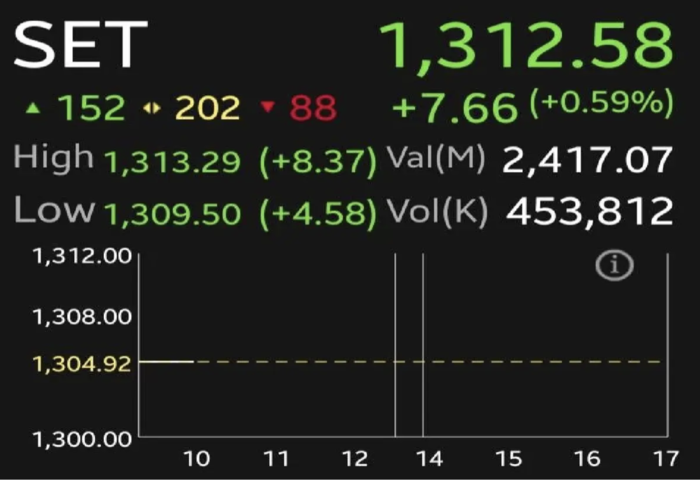 (台泰時報10月9日電)泰國股市9日早盤開出紅盤,受外資調升評等帶動,電子龍頭股DELTA強勢上漲4.44%,成為主要支撐力量。市場情緒回暖,SET指數開盤上揚7.66點或0.59%,報1,312.58點,成交金額達24.17億銖,投資人對AI概念股再度展現關注。