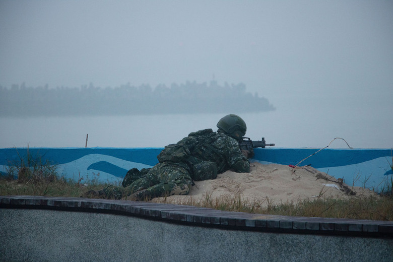 陸軍金門防衛指揮部18日在金門烈嶼實施民國115年第1季太武操演,烈嶼守備大隊官兵運用建制武器,進行驅離射擊、近岸防禦灘岸戰鬥等課目。(中央社記者吳玟嶸攝)
