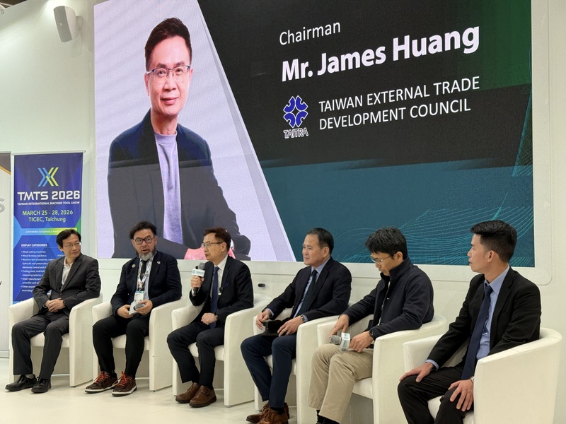 展會首日,台灣館舉行「開創未來,AI台灣工具機」國際記者會,由貿協董事長黃志芳主持,經濟部次長江文若與機械公會理事長莊大立、工具機公會理事長陳紳騰出席,分享AI製造與數位轉型台灣視角,吸引國際媒體與買家關注。