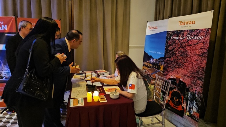 此外,設置「探索台灣」文化體驗區,讓賓客在觀光宣傳看板前選寫書法書籤,廣受外賓及台僑好評。有外賓表示,選擇落款的字彷彿展開了一趟前往台灣的旅程。