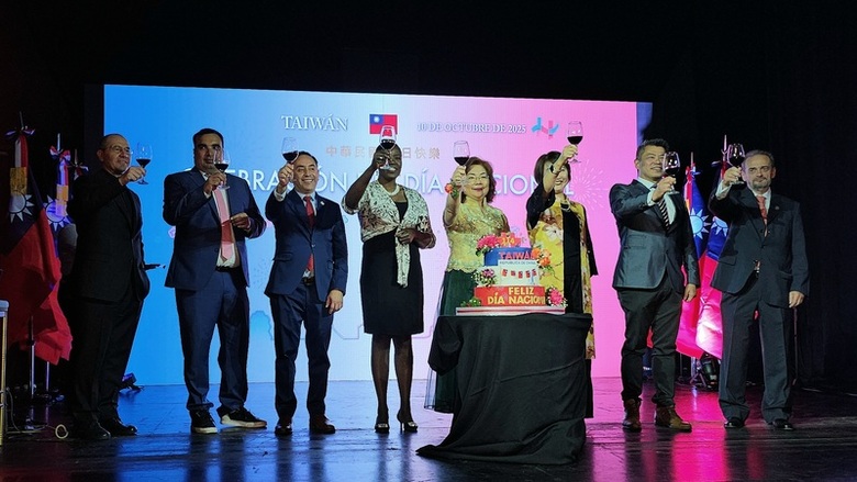 駐阿根廷代表謝妙宏(右4)與多國外交使節、旅阿僑領舉杯祝賀雙十國慶,強調台海和平與穩定關乎全球安全,呼籲國際社會共同維護民主與自由價值。(中央社記者黃韻如布宜諾斯艾利斯攝)