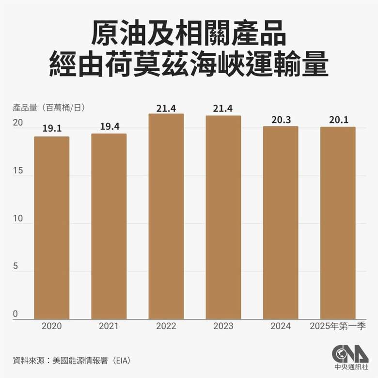 美國能源情報署(EIA)估計,2025年每日約有2000萬桶原油及相關產品通過荷莫茲海峽,年度能源貿易額為將近6000億美元(約新台幣19兆元)。