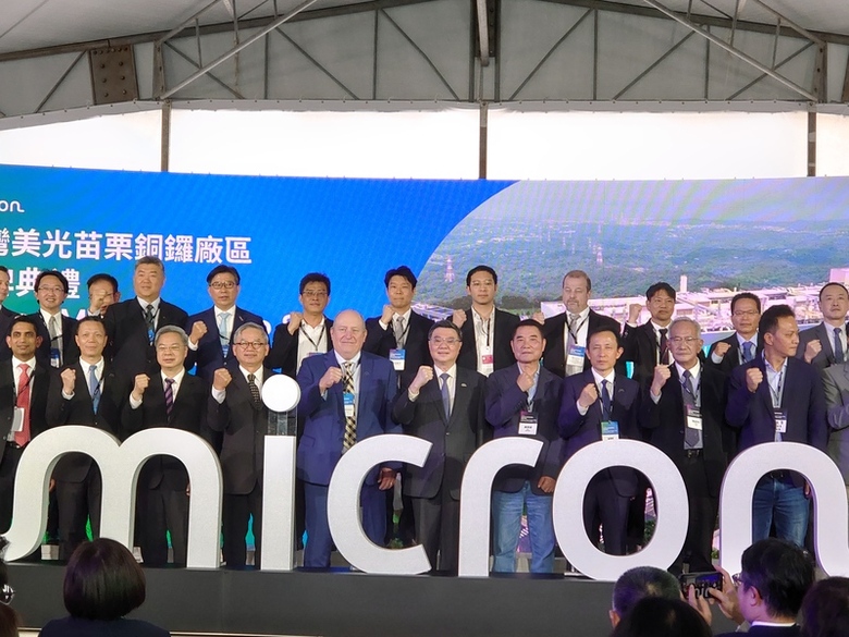 記憶體廠美光(Micron)26日舉辦苗栗銅鑼廠區揭牌典禮,行政院長卓榮泰致詞強調,政府一定會跟企業一起用最快的速度、最高的效率來從事這項合作。圖為與會人員合影。(中央社記者張建中攝)