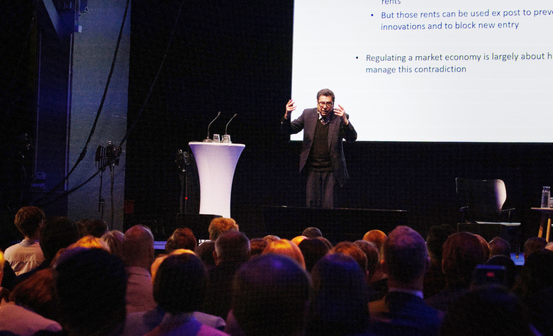 2025年諾貝爾經濟學獎得主阿吉翁在「動盪時代的經濟成長」論壇擔任主題演講人。(中央社記者巫祈麟赫爾辛基)