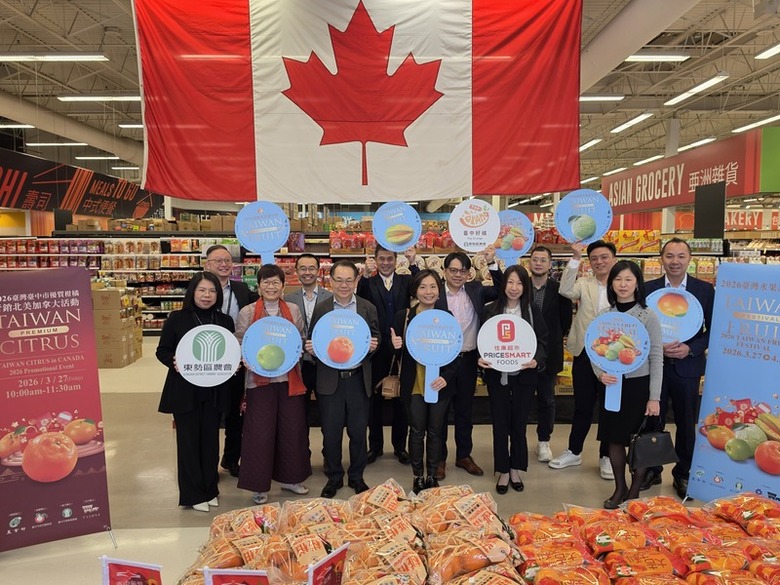 由PriceSmart Foods超市與Taione Trading進口商合辦的「2026台灣水果嘉年華」27日揭幕,加拿大眾議員區澤光(Chak Au)、卑詩省議員屈潔冰(Teresa Wat)、駐溫哥華台北經濟文化辦事處長劉立欣、台中市東勢區農會供銷部主任古滿琴和PriceSmart總監何錦輝(Jacky Ho)等出席。