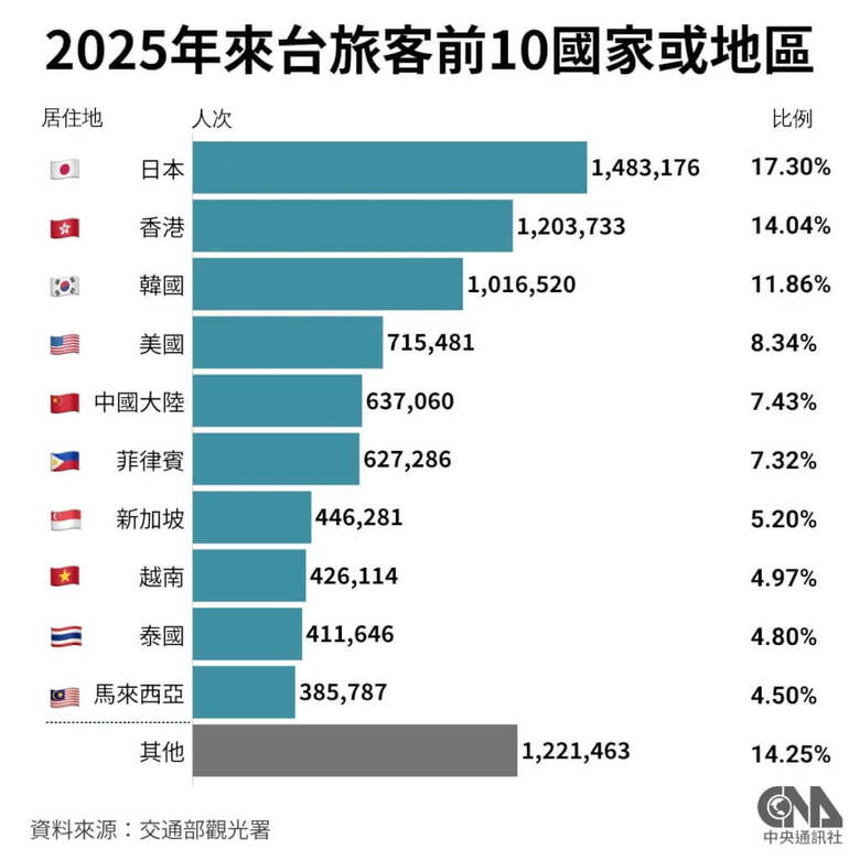 2025年來台旅客約857.4萬人次,日本、港澳、韓國等主要市場均達百萬人次規模。(中央社製圖)