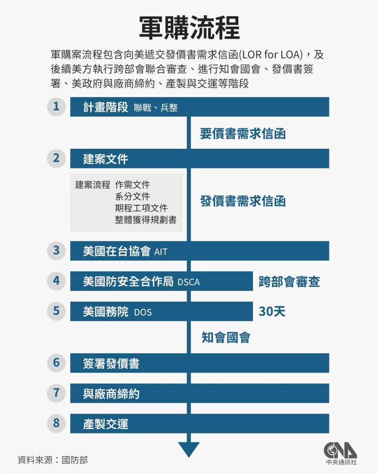根據國防部2月6日發布的新聞稿指出,美政府就「強化防衛韌性及不對稱戰力」特別預算中「拖式飛彈續購」、「標槍反甲飛彈續購」、「M109A7自走砲」等3項軍售案,正式向台灣提供發價書草案,有效期至今年3月15日,依軍售作業制度,若未能獲得美方同意、展延發價書簽署效期,台灣需於3月31日支付首期款。