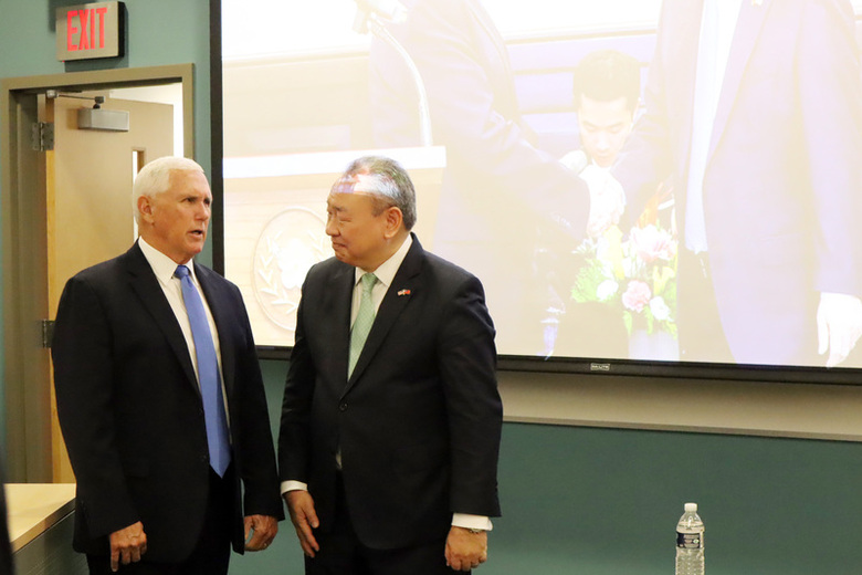美國前副總統彭斯(左)9日於華府喬治梅森大學發表演說,駐美代表俞大㵢(右)出席。(中央社記者鍾佑貞華盛頓攝)