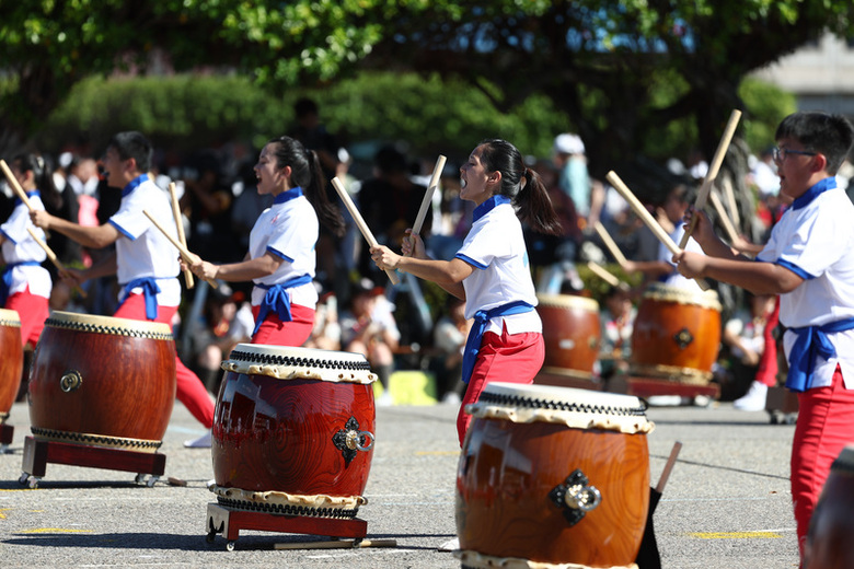 (中央社台北10日電)慶祝中華民國114年國慶大會今天舉行,台灣太鼓協會「鴻福齊天 祈鼓獻瑞」揭開序幕暖場,近百人在總統府前擺開陣勢擊打太鼓,展現鼓韻和鳴,國防部三軍儀隊展現精湛操槍技術與隊形變換,獲得全場喝采。