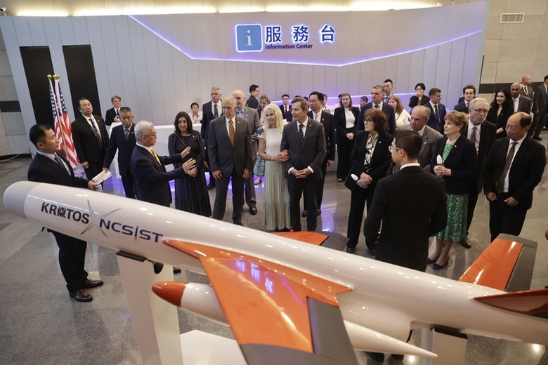 訪團上午在總統府晉見總統賴清德後,下午前往國造武器研發重鎮的國家中山科學研究院,國安會秘書長吳釗燮、國防部副部長徐斯儉陪同接待,並由中科院進行閉門簡報。參訪現場展出勁蜂2型、3型,以及銳鳶2型無人機、10吋雷射標定光電酬載、PSD-250小型渦輪噴射引擎、多用途無人機彈頭、Dive-LD水下自主航行無人載具。