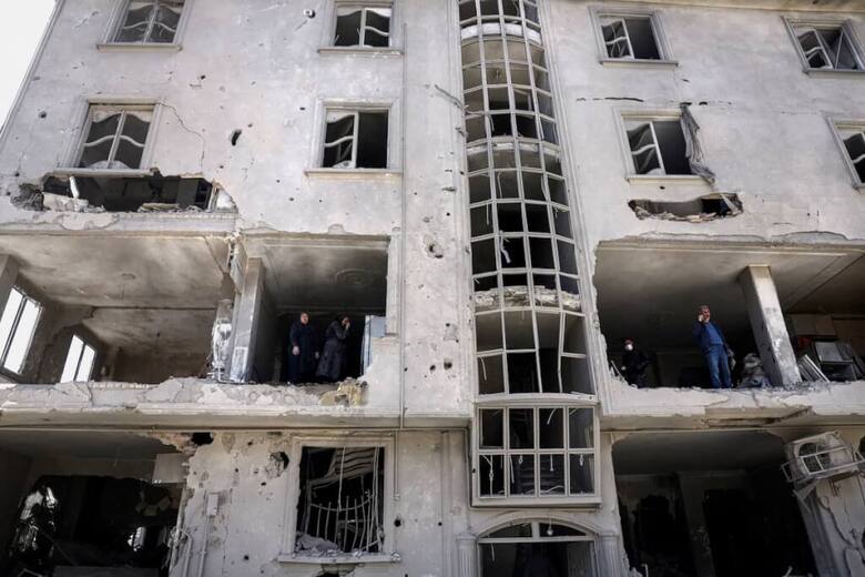 美國與以色列對伊朗發生衝突期間,民眾30日在伊朗德黑蘭查看一棟遭攻擊受損的住宅大樓。(West Asia News Agency via路透社)