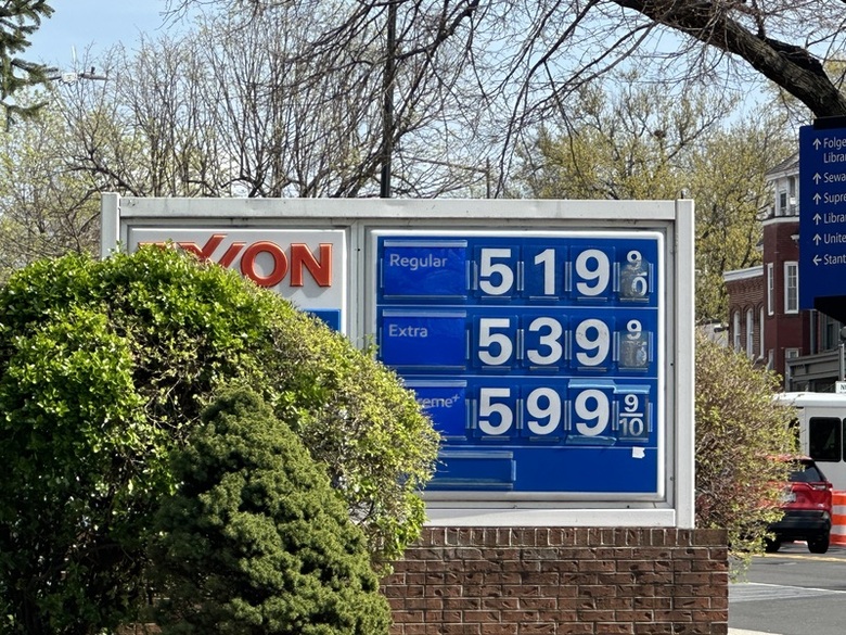 美國平均汽車零售油價每加侖已升破4美元,圖為首都華盛頓特區市中心一處加油站,各級汽油均超過5美元。(中央社記者廖漢原華盛頓攝)