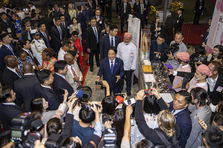 114年國慶酒會10日晚間在台北賓館登場,總統賴清德(中)出席與外賓同並共進美食,也在攤位前接受媒體訪問。(中央社記者鄭清元攝)