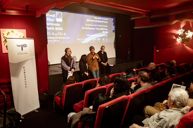 巴黎台灣電影節由駐法台灣文化中心、巴黎拉丁區指標藝文電影院Filmothèque共同合作。圖為4月1日開幕片現場,左1為戲院負責人柯塞,右1為法國影評人傅洛東,右2為本屆焦點影人曹仕翰。(中央社記者李若韻巴黎攝)