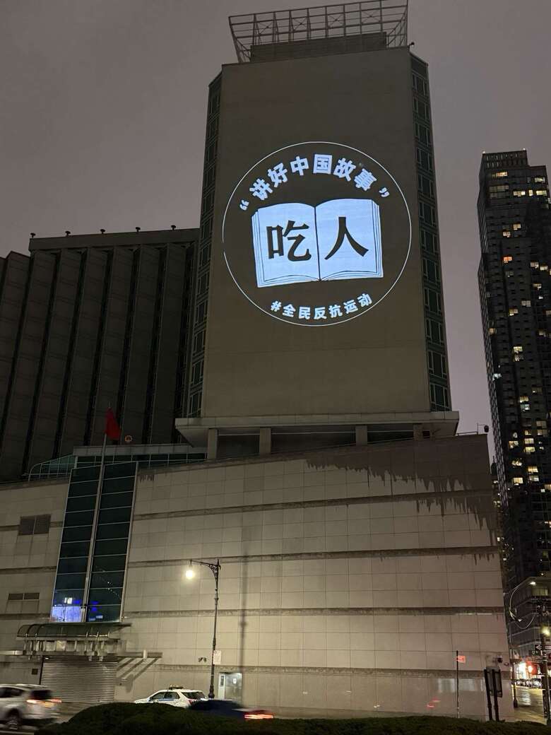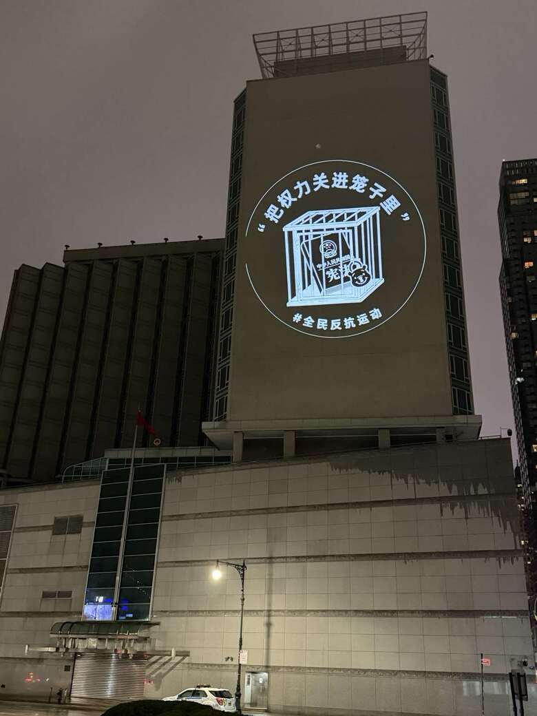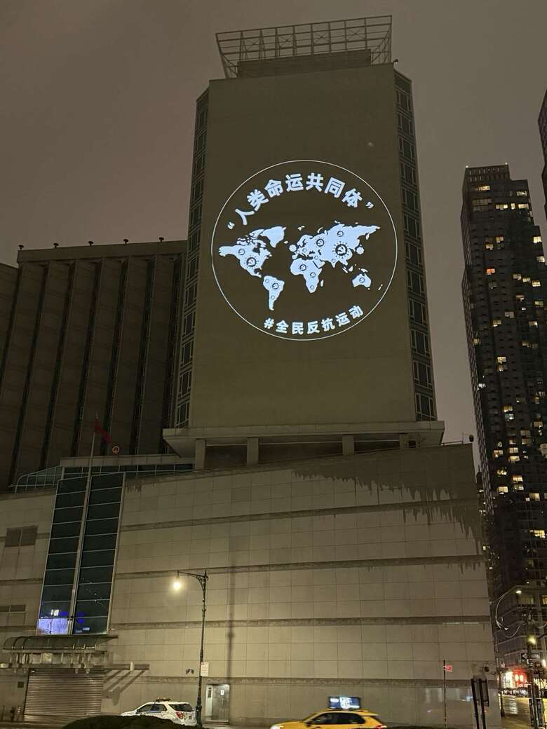 而上次和投影者展開「光影大戰」的紐約中領館,當晚毫無設防,「中國行動」在外牆投影了4幅關於「愚民節」的主題系列圖像,標語內容包括「中國沒有愚民節」、「把權力關進籠子裡」、「人類命運共同體」、「講好中國故事」。