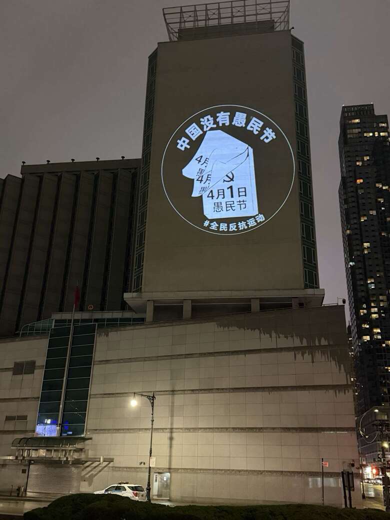 (央廣新聞台北3日訊)海外人權組織「中國行動」(China Action)首次展開聯合性的反共投影行動,選在愚人節,將嘲諷「中國有互聯網」、「中國沒有愚民節」等大型圖像,分別投影在中國駐舊金山總領事館和中國駐紐約總領事館。