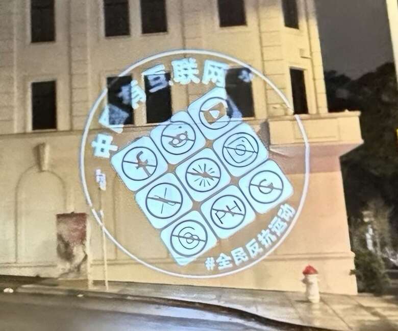 「中國行動」指出,在華盛頓,疑似使館已掌握消息,部署了40盞強光燈,讓整個館在夜晚「亮如白晝」,還派出20多位保安人員在館外嚴陣以待,殊不知他們被愚弄,一幅「中國有互聯網」的大型圖像,正投影在中國駐舊金山總領事館的外牆上,圖像中的「九宮格」,分別是Facebook、Reddit、YouTube、X、Wikipedia、Instagram、Threads、Pornhub和Google等9個社交媒體的標誌,上面全被劃了「斜線」,也就是全遭禁用,藉此諷刺中國「哪有互聯網」。