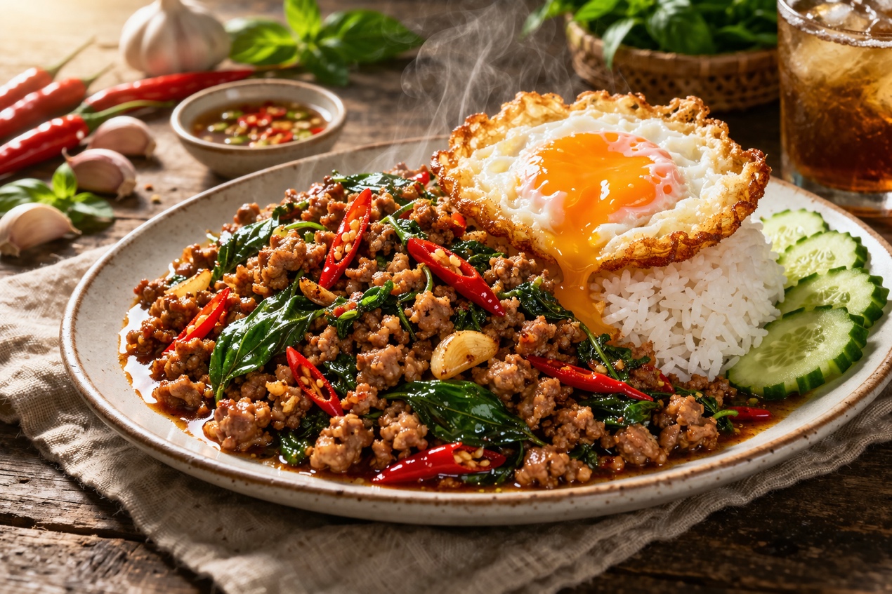 這道以打拋葉拌炒肉類、搭配白飯與荷包蛋的料理,幾乎存在於城市的每一個角落。它不需要預約、不需要等待,價格親民、製作快速,從辦公大樓旁的簡餐店,到巷口的路邊攤,都可以在幾分鐘內端上一盤熱氣騰騰的打拋飯。