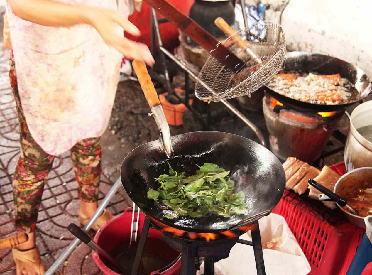 在高溫快火之下,蒜頭、辣椒與打拋葉迅速翻炒,幾分鐘內完成一盤打拋。(圖片來源:網路)