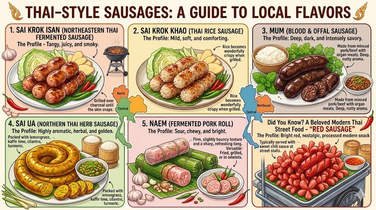 其中,東北地區代表性的依善香腸(Sai Krok Isan),以豬絞肉、熟米、蒜與鹽製成,經自然發酵後帶有柔和酸味與淡淡煙燻氣息。其酸味並非強烈刺激,而是圓潤且具有發酵特徵,常以炭火燒烤至外皮酥脆,搭配生高麗菜、薑片與辣椒食用,以平衡油脂口感。