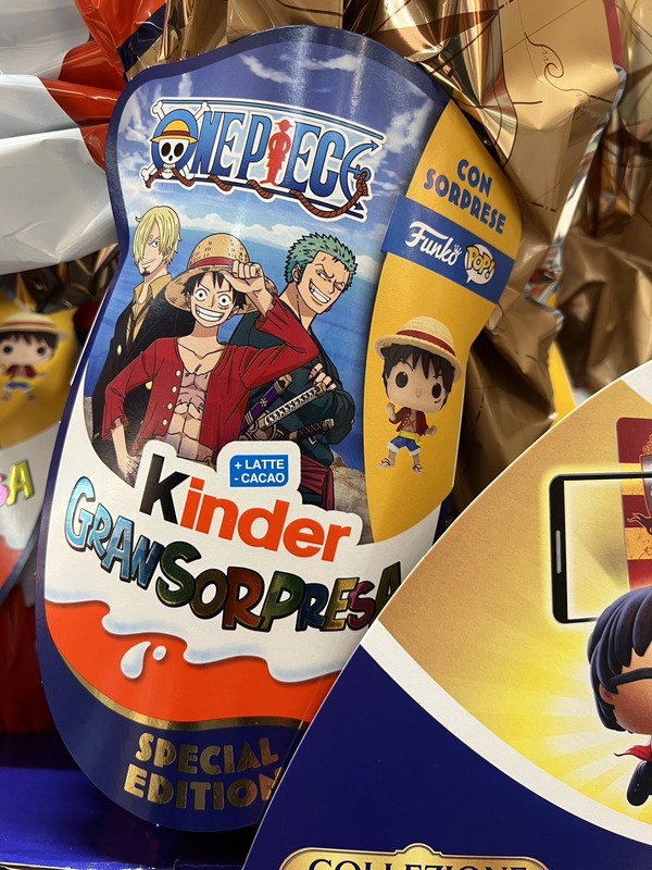 走進義大利大型超市,上百顆巧克力蛋堆成小山十分壯觀。一般送給兒童的平價巧克力蛋價格約為10到15歐元(約370至550台幣),彩蛋封面會標示內含哪類驚喜禮品,選擇十分「國際化」,有日系Hello Kitty彩蛋,韓系「魷魚遊戲」彩蛋,航海王(ONE PIECE)、以及寶可夢、蜘蛛人、美國隊長等動漫角色應有盡有。