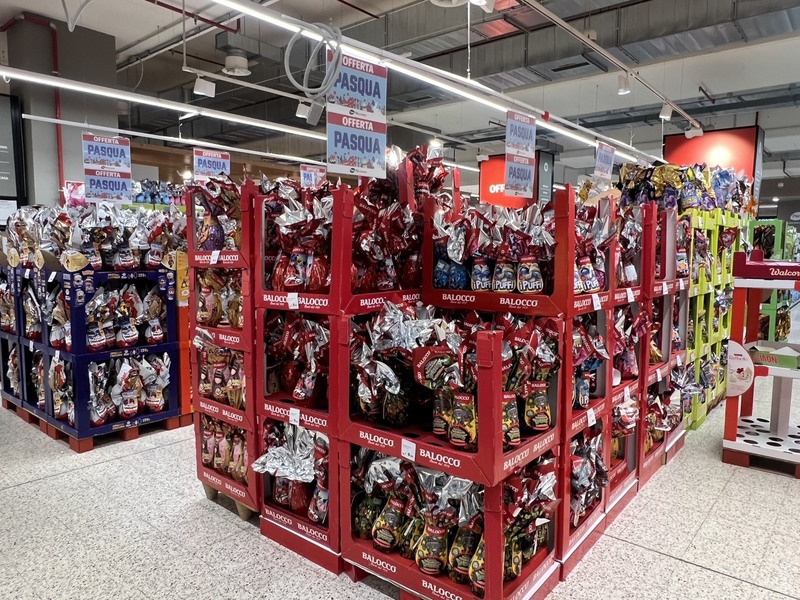 復活節到來,義大利大型超市的巧克力蛋禮品堆成小山,有好幾個區域都是巧克力蛋專門展示區。(中央社記者黃雅詩羅馬攝)