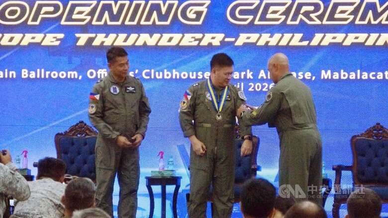 菲美空軍6日在菲律賓中部的克拉克空軍基地,展開2026年度「雷霆對抗」首輪演習,雙方指揮官在開幕儀式上互為對方掛上臂章。(中央社記者林行健克拉克空軍基地攝)