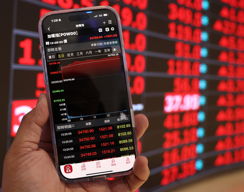 台股8日開高走高,終場收在34761.38最高點,上漲1531.56點,創下史上第2大收盤漲點。(中央社記者張新偉攝)