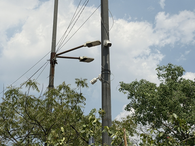 印度強化國家安全,4月起全面禁用不合規定的監視器,光是德里街頭,就需拆除約14萬支中國製監視器,並傾向以國貨取代這些設備,而這些印度本土品牌的監視器,高度仰賴台灣的晶片。圖為印度街頭的監視器。(中央社記者李晉緯新德里攝)