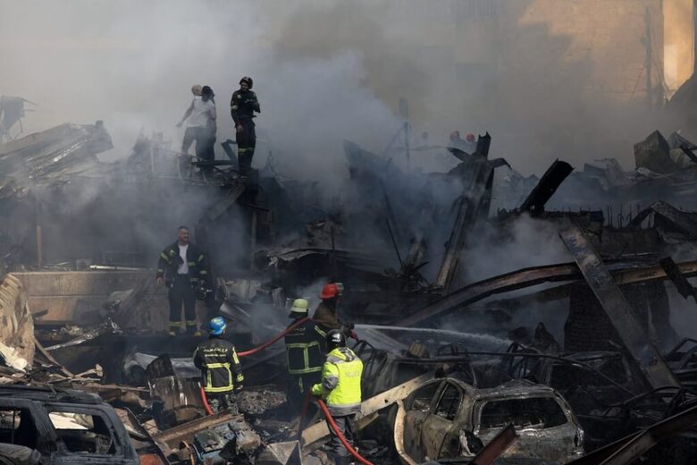 黎巴嫩貝魯特遭以色列空襲,救援人員在現場作業。(路透社)