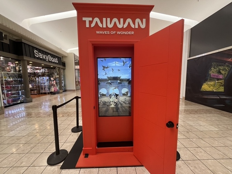 觀光署推動國際旅客在台灣轉機,近日在西雅圖都會區購物中心搭建「時光門」,每扇門拉開都能透過沉浸式影像感受北台灣經典場景。(觀光署提供,中央社記者張欣瑜舊金山傳真)