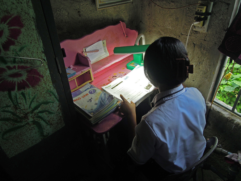 越南貧童黎氏黃鶯相當懂事,為了給媽媽更好的生活,每天都會在屋內的小書桌前唸書6小時,希望透過學習翻轉人生。(中央社記者吳欣紜攝)