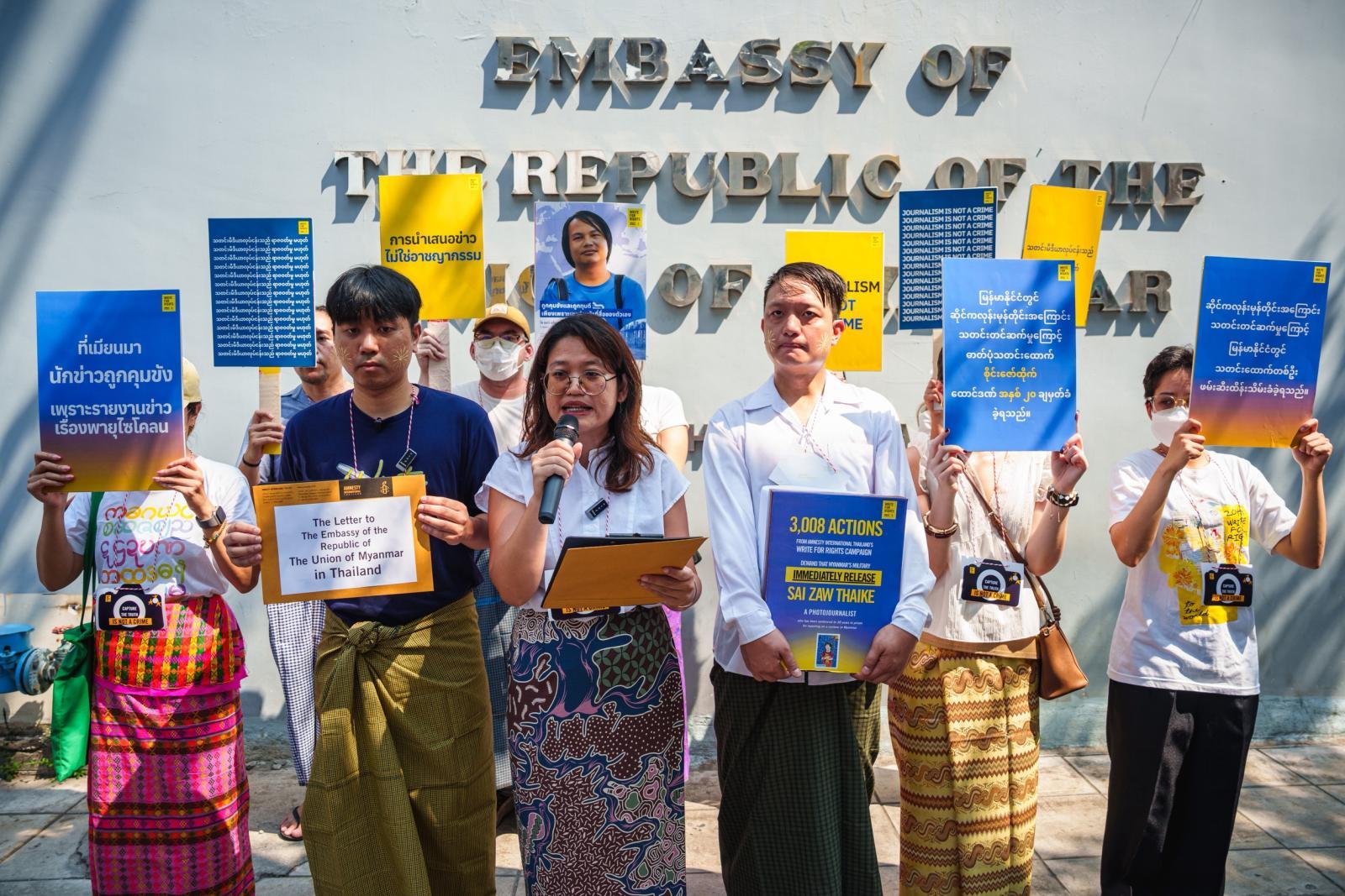 (台泰時報4月10日電)國際特赦組織泰國分會(Amnesty International Thailand)8日向緬甸駐泰國大使館遞交共3,008項連署行動,呼籲緬甸當局釋放遭軍事法庭判刑20年的攝影記者賽佐泰(Sai Zaw Thaike),並強調新聞報導不應構成犯罪。