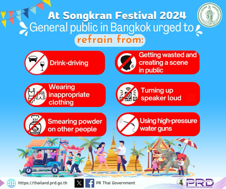 泰國政府於潑水節期間發布之行為規範圖示,包括禁止抹白粉、限制酒精與高壓水槍等措施。隨著節慶規模擴大,相關管理逐漸制度化,以平衡觀光活動與公共安全。(圖片來源:泰國公關部)