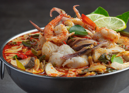 「冬蔭功」(Tom Yum)為泰國知名湯品,以香茅、南薑、檸檬葉等香料熬製而成,風味以酸辣為主。其名稱源自泰語,「Tom」意指煮沸過程,「Yum」則代表混合調味,反映料理方式與風味特色。