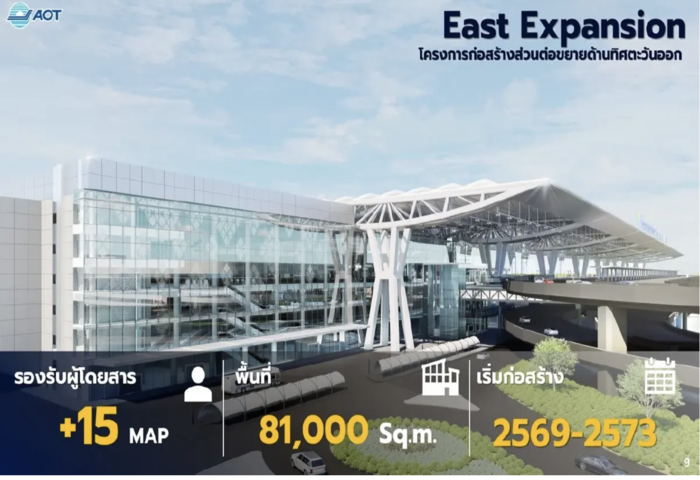 AOT代理總裁帕維娜(Pavina Chariyathitpong)表示,東擴計畫總投資額約120億泰銖,將新增面積8.1萬平方公尺,可年增旅客容量1,500萬人。該案目前正待內閣審議核准,若能於年底獲批,預計2025年可完成招標程序,2026年正式開工,2030年竣工啟用。屆時,素萬那普機場的年旅客接待量將由現行6,500萬人提升至7,000至8,000萬人。