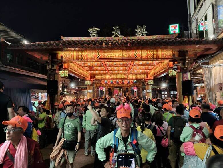 2026苗栗通霄白沙屯媽祖往北港進香活動將於12日深夜登轎儀式後出發,入夜後拱天宮前已聚集大批「香燈腳」蓄勢待發。(中央社記者管瑞平攝)