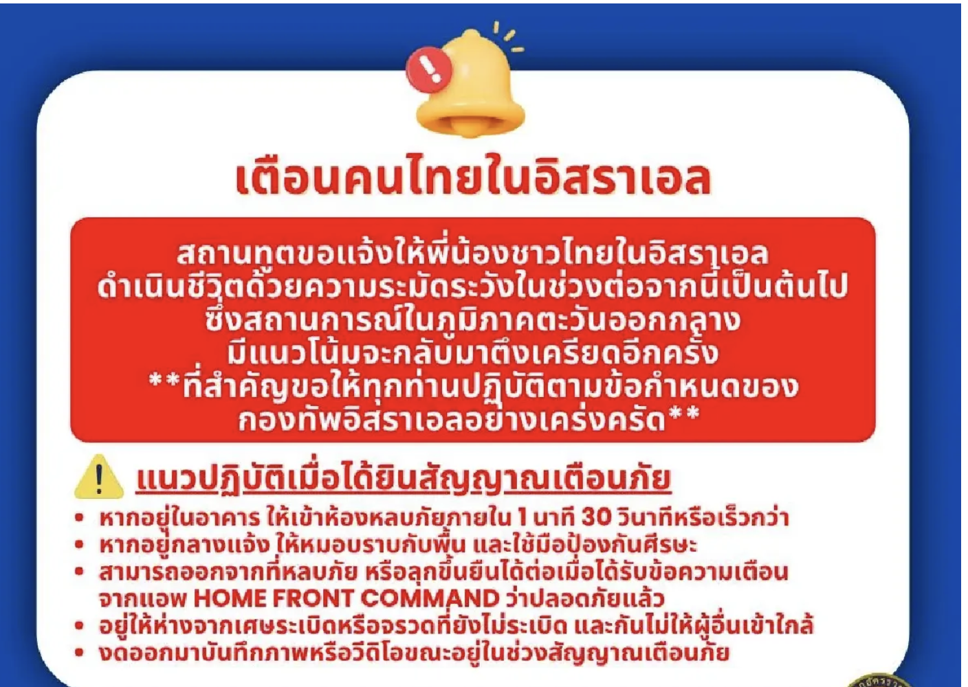 根據大使館透過官方臉書專頁發布的訊息,該公告於4月13日晚間約21時15分對外說明,指出近期中東情勢變化快速,安全風險上升,可能影響在地外籍人士生活。館方特別強調,所有在以色列境內的泰國人應密切關注官方資訊,並依循軍方與相關單位發布的規定與措施,以確保自身安全。