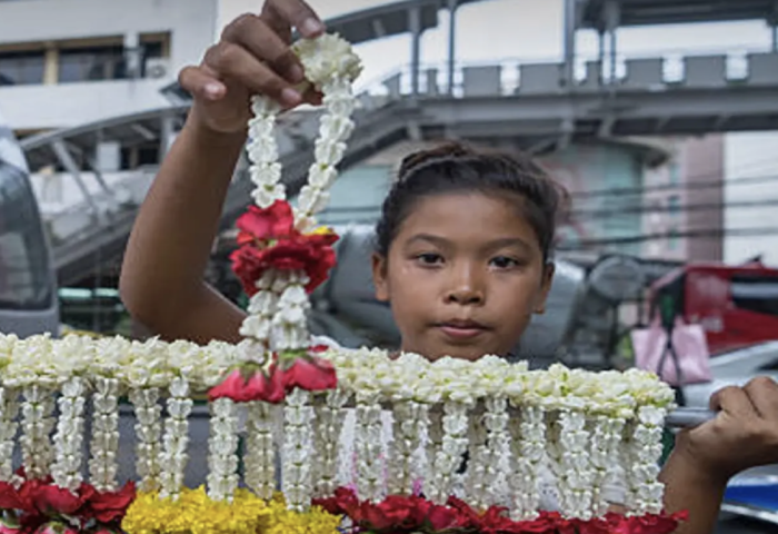 (台泰時報10月12日電)在曼谷車水馬龍的街頭,紅燈一亮,總能見到街販穿梭於車陣之間,兜售油炸香蕉、青芒果、甜甜圈或主動擦拭車窗。然而,最常見的商品,莫過於掛在車前鏡的花環——泰語稱為「Phuang Malai」,不僅是香氣四溢的飾品,更承載著泰人對平安出行的祈願與信仰。