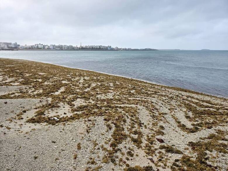 澎湖馬公草仔尾、嵵裡等多處潮間帶、岸際、沙灘上,隨著潮起潮落,布滿了隨波脫落的各式海藻,有紅色、綠色和褐色等顏色,數量之多,幾乎布滿或疊覆在岸際上。