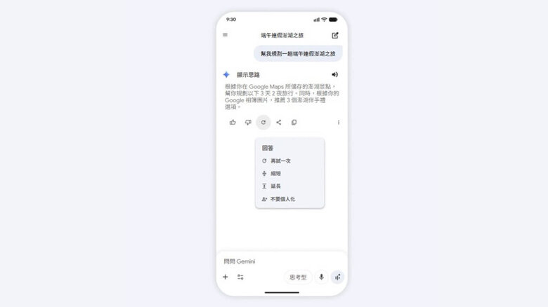 例如,當用戶規劃端午連假前往澎湖旅遊時,只需詢問Gemini,它就可以整理Gmail中的訂單資訊,結合相簿中的收藏與YouTube的觀看紀錄,生成完整行程與個人化推薦,不需在多個應用程式間切換。