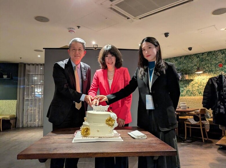 台灣旅英學生總會(SUROCUK)成立50週年,11日在倫敦舉行晚宴並特製蛋糕慶祝,駐英國副代表江雅綺(中)、駐英國代表處教育組組長畢祖安(左)、SUROCUK會長李冠蓁(右)一同切蛋糕。(中央社記者陳韻聿倫敦攝)